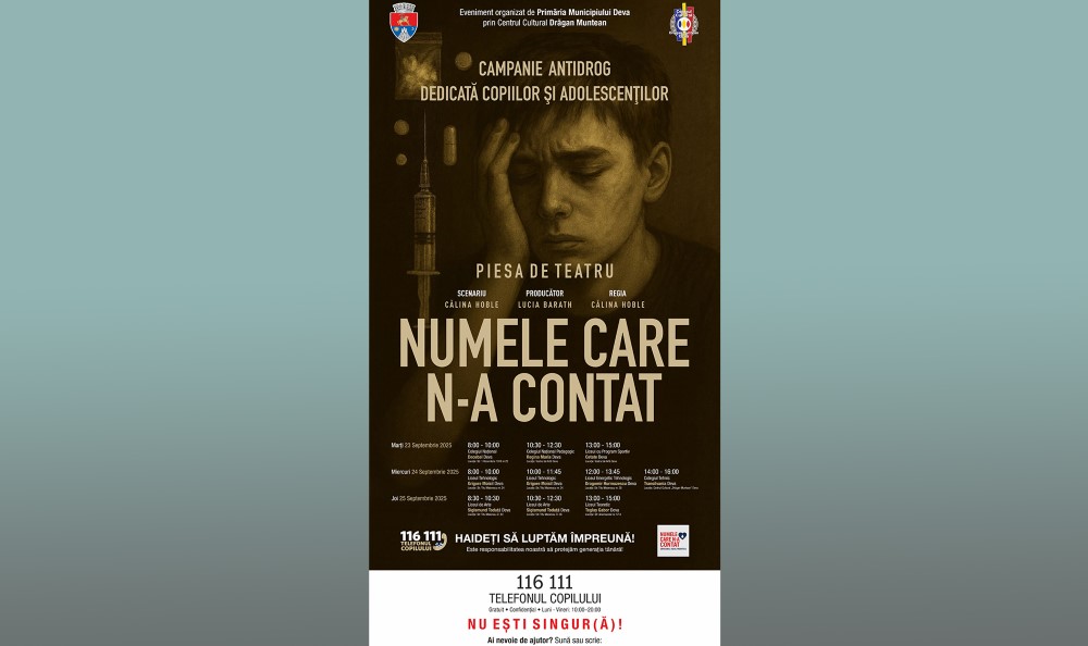 În perioada 23–25 septembrie 2025, elevii din mai multe unități de învățământ din municipiul Deva vor putea viziona piesa de teatru „Numele care n-a contat”, în regia și după scenariul Călinei Hoble – o producție artistică ce abordează, cu realism și sensibilitate, efectele consumului de droguri în rândul tinerilor.