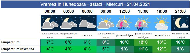 Miercuri, zi cu nori, ploi și descărcări electrice. Soarele va răsări la ora 06:32. Vremea se menține închisă, dar se va încălzi ușor. Va ploua pe arii extinse, în averse însoțite de descărcări electrice. La munte, în zonele înalte, se vor semnala precipitații mixte. Soarele va apune la ora 20:23. Valorile termice se vor situa între 6 și 8 grade, iar cele maxime între 10 și 13 grade.