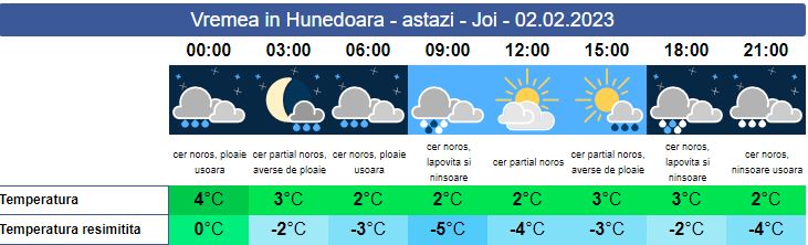Joi, vremea va fi mai mult umedă. Soarele răsare la ora 07:47. Pe arii extinse se vor semnala ploi, pe tot parcursul nopții, iar peste zi vremea va fi schimbătoare cu perioade de ploi și cer variabil, iar spre seara va ninge. La munte va ninge consistent, iar vântul va sufla viscolit care la rafală poate depăși 100km/h determinând scăderea vizibilității sub 50 metri. Soarele va apune la ora 17:36. Temperaturile se vor situa între 2 și 4 grade, iar la munte, în jurul valorii de -12 grade.