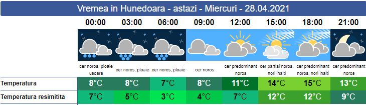 Miercuri, vremea rece și ploioasă. Soarele răsare la ora 06:19. În această noapte se anunță ploi însemnate pe arii extinse. Cea mai mare parte a zilei va fi sub griul norilor. La munte vor fi precipitații mixte, iar vântul va sufla cu intensitate, în special în zona Carpaților Meridionali. Soarele va apune la ora 20:32. Valorile termice se vor situa între 7 și 15 grade.