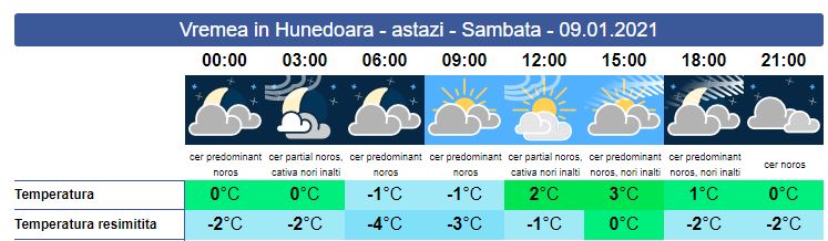Sâmbătă, vremea se încadrează în valorile normale pentru această dată. Soarele răsare la ora 08:06. Ca aspect, cerul a fi mai mult noros, doar izolat vor mai fi precipitații sub formă de lapoviță și ninsoare. Vântul va sufla cu unele intensificări la munte. Soarele va apune la ora 17:04. Temperatura maximă se va situa în jurul valorii de 3 grade, iar minima zilei se va resimții între-4 și 0 grade.