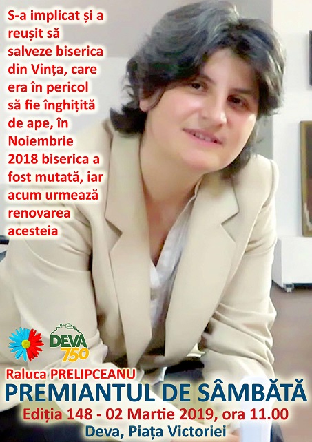 Pentru toate acestea, pentru modul în care s-a dedicat tezaurizării valorilor românești, pentru modul în care a ales să transfere mai departe tradițiile autentice ale poporului român, vă propunem să ne întâlnim cu ea. Sâmbătă, 02 Martie 2019, ora 11.00, artistul, omul, Raluca Prelipceanu vine la Deva, în Piața Victoriei, la „Premianții fără premii”. Puteți și sunteți rugați să faceți parte din cei care-i vor mulțumi prin oferirea unei diplome și a unui buchet de flori tricolor.