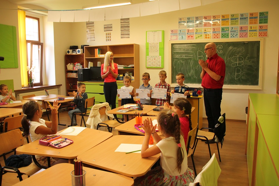 În clasă, anunţul a fost făcut chiar de directorul CN Decebal Deva, Florin Ilieş: „Au venit diplomele pentru concursul la care aţi participat anul trecut, un concurs de desene şi colaj. Lucrările voastre au fost evaluate la etapa naţională şi au sosit premiile!” Micuţii artişti premiaţi au fost poftiţi în faţa clasei unde li s-au înmânat premiile. Elevii de şase şi şapte anişori au venit plini de emoţii să îşi ia diplomele şi să fie felicitaţi. Sophia Florea–Dănescu a ales să deseneze un adăpost pentru căţeii. Alături de cuştile cu animale orfane, s-a desenat pe ea alături de Frau Mirela Blaj care a adoptat un micuţ părăsit: „Am desenat căţeluşii abandonaţi, pe mine şi pe Frau care ajutăm nişte câini. Sunt bucuroasă că am luat cel mai bun premiu pe ţară. Mie îmi place să desenez pentru că e foarte frumos, e ca un vis.” Luca Gherghe a luat locul I la colaje: „Eu am făcut o faţă zâmbitoare, cu guriţă şi ochi mobili din hârtie creponată. I-am pus şi pălărie. Este o bucurie să fiu artist!” David Ştefan a primit locul II pentru colajul său: „Eu am făcut un peisaj de primăvară unde mi-am prezentat emoţiile. Am folosit culori vii şi hârtie. E bine că am diploma asta şi sunt cu colegii mei şi cu Frau.” Rareş Dobrei a luat menţiune la desen: „Eu am desenat copiii cu Frau când ne jucam. Îmi place să desenez şi desenez tot timpul. Şi pe pereţi!”