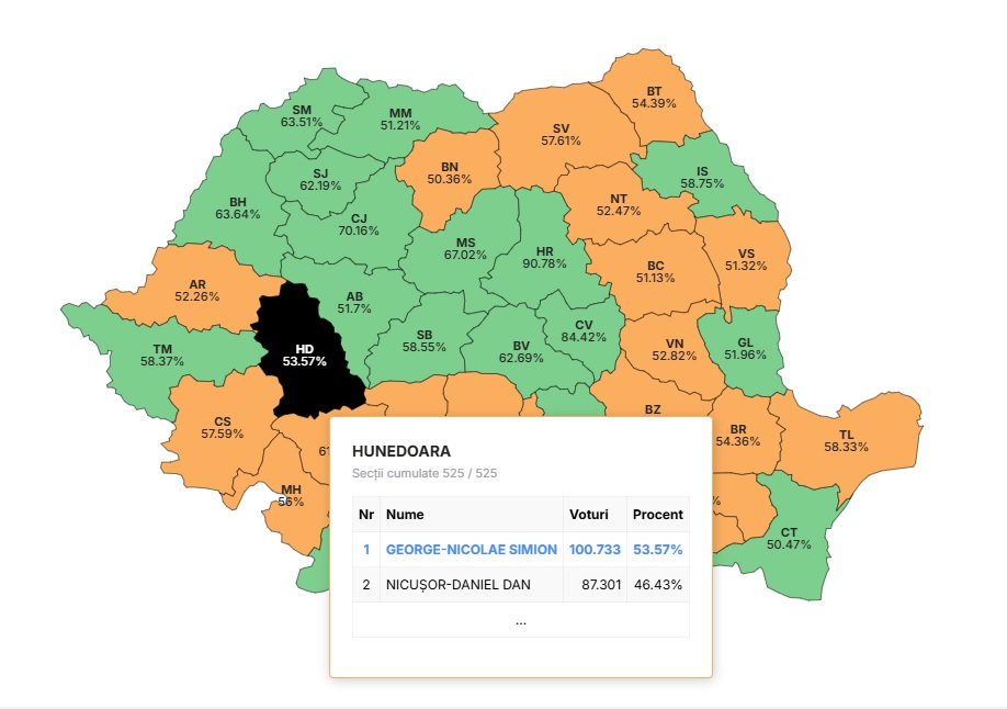 Astfel, deși a pierdut la nivel national, George Simion a câștigat scrutinul în județul Hunedoara, cu 53,57 %, respectiv 100.733 voturi. Președintele ales, Nicușor Dan, a obținut, de la hunedoreni, doar 46,43%, respectiv 87.301 voturi.