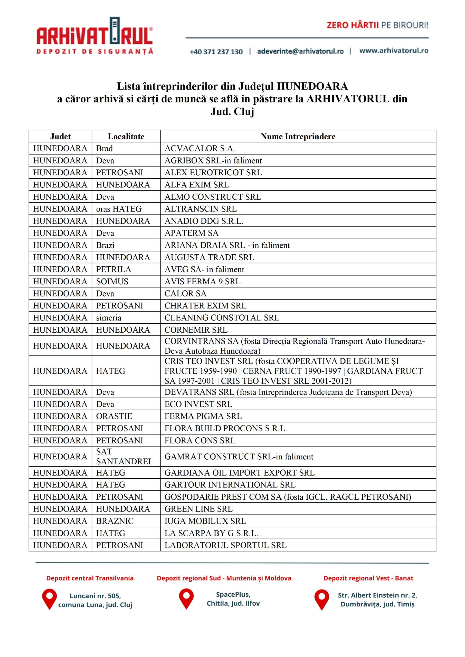 Ca urmare a solicitării primite, Primăria Municipiului Deva sprijină demersul de informare publică și va publica lista întreprinderilor ale căror arhive se află în păstrare la ARHIVATORUL – Depozitul Arhivele Transilvania SRL, pentru a facilita accesul cetățenilor la aceste documente.