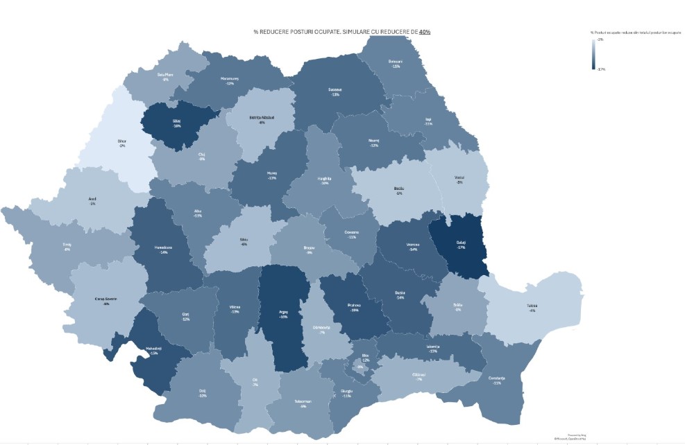 O simulare națională privind reducerea cu 40% a personalului arată că impactul măsurii variază mult între județe. Media națională a scăderii posturilor ocupate este de -10%, însă județe precum Galați (-17%) și Sălaj (-16%) sunt mult mai afectate, în timp ce Bihor (-2%) și Tulcea (-4%) resimt cel mai puțin efectele.