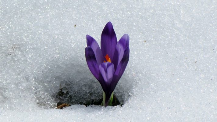 Fragilele brândușe ies de sub mantia de zăpadă. Natura șoptește sfios că primăvara se apropie și în inima munților. Movul brândușelor contrastează cu albul zăpezii și cu albastrul cerului.
