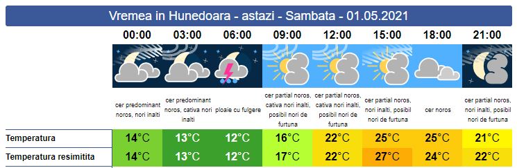 Sâmbătă, temperaturi văratice. Soarele răsare la ora 06:14. Spre dimineață se anunță ploi, însoțite de tunete și fulgere. Până la sfârșitul zilei cerul va fi parțial noros, cu instabilitate atmosferică, iar pe arii restrânse e posibil să cadă averse și cu totul izolat grindina. Soarele va apune la ora 20:36. Valorile minime se vor înregistra între 12 și 16 grade, iar cele maxime între 22 și 25 de grade.