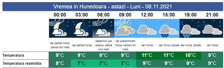 Luni, temperaturile scad treptat. Soarele răsare la ora 07:16. În general, se anunță vreme mai mult închisă și se vor semnala precipitații, spre partea a doua a zilei. La munte, în zonele înalte precipitațiile vor fi sub formă de lapoviță și ninsoare. Vântul va sufla slab spre moderat, iar soarele va apune la ora 17:01. Temperaturile zilei se vor încadra între 9 și 11 grade.