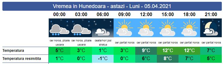 Luni, soarele se va arătă printre nori. Soarele răsare la ora 07:00.Temperaturile nocturne sunt și mai scăzute pentru această perioadă, iar pe alocuri se vor înregistra averse. La munte, precipitațiile vor fi sub formă de ninsoare. Atât norii, cât și soarele vor fi prezenți pe cer pe tot parcursul zilei. Vântul va sufla slab și moderat, cu unele intensificări în zonele înalte. Soarele va apune la ora 20:02. Valorile minime se vor încadra între 1 și 5 grade, iar maximele între 9 și 12 grade.