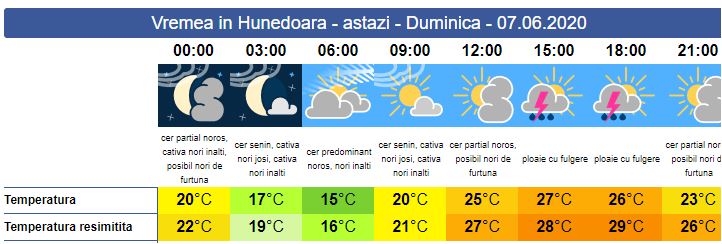 Duminică, vremea continuă să fie instabilă și cu temperaturi ce se resimt mai ridicate față de cele indicate în termometre. Soarele răsare la ora 05:37. Cerul va fi, în general, acoperit cu nori, dar se vor arăta și perioade însorite. Spre amiază se va înnora accentuat, iar pe arii extinse va ploua și se vor semnala descărcări electrice. Vântul va prezenta unele intensificări, iar pe alocuri va lua aspect de vijelie. Soarele va apune la ora 21:16. Temperaturile minime se vor încadra între 15 și 20 de grade, iar maxima zilei va depăși 27 de grade.