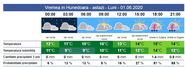 Luni, săptămâna debutează cu atmosferă instabilă și temperaturi sub media climatologică din această perioadă. Soarele răsare la ora 05:39. Norii vor predomina cerul. Pe parcursul zilei se vor înregistra scurte reprize de soare, dar vor cădea și precipitații sub formă de ploaie însoțite de descărcări electrice și intensificări ale vântului, pe arii extinse. La munte precipitațiile vor fi sub formă de lapoviță și ninsoare. Soarele va apune la ora 21:12. Temperaturile minime se vor încadra între 10 și 12 grade, iar cele maxime între 13 și 15 grade.