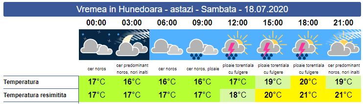 Sâmbătă, se anunță instabilitate atmosferică pe parcursul întregii zi. Soarele răsare la ora 05:55. Vreme va fi în general răcoroasă față de ziua precedentă, iar aversele ce vor cădea pe arii extinse, vor fi abundente, depășind local 15-20 l/mp, iar izolat 30-40 l/mp. Se vor înregistra frecvente fenomene electrice și intensificări de scurtă durată ale vântului. Soarele apune la ora 21:14. Valorile maxime nu vor depăși 21 de grade.