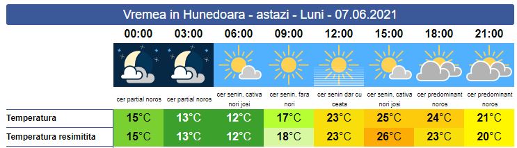 Luni, se anunță o vreme caldă. Soarele răsare la ora 05:37. În general, cerul va fi mai mult senin, până spre seară când se anunță înnorări pe arii extinse. Vântul va sufla slab spre moderat, iar șansele de ploaie sunt minime, în zona noastră. Soarele va apune la ora 21:16. Temperaturile minime se vor situa între 12 și 15 grade, iar cele maxime între 23-25 de grade.