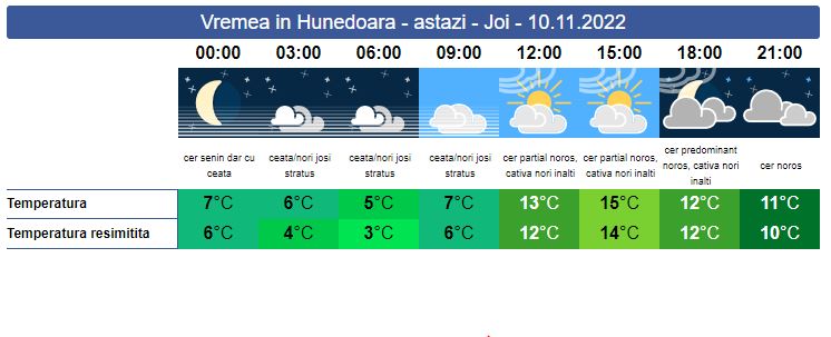 Joi, până în momentul de față, atmosfera se menține la nivelul zilei precedente. Soarele răsare la ora 07:18, dar va sta ascuns mai mult sub stratul de ceață sau nori joși. Temperaturile de peste zi se mențin ridicate pentru data din calendar. Vântul va sufla cu ceva intensificări, în zonele înalte. Soarele va apune la ora 17:05. Minimele se încadrează între 3 și 7 grade, iar maximele se vor încadra în jurul valorii de 15 grade.