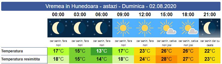 Duminică, vremea nu prezintă schimbări semnificative față de ziua precedentă. Soarele răsare la ora 06:11. Vom avea parte de o zi frumoasă, în general cu cer senin. Dimineața e răcoroasă pentru această perioadă, iar pe timpul zilei, temperaturile se încadrează în normalul perioadei. Soarele va apune la ora 20:57. Valoarea maximă resimțită se va înregistra în jur de 28 de grade.