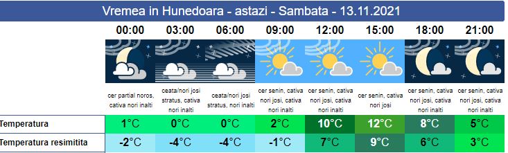 Sâmbătă, peste zi temperaturile cresc ușor. Soarele răsare la ora 07:21. În această noapte temperaturile vor fi sub pragul de îngheț și se va înregistra ceață și nori joși. Peste zi soarele va fi mai generos față de zilele trecute. Pentru cine pleacă la munte, ziua de sâmbătă va fi perfectă, cu mai mult soare față de zonele joase, doar vântul va bate cu unele intensificări. Mândrul astru va apune la ora 17:03. Maxima zilei va urca în jurul valorii de 12 grade.
