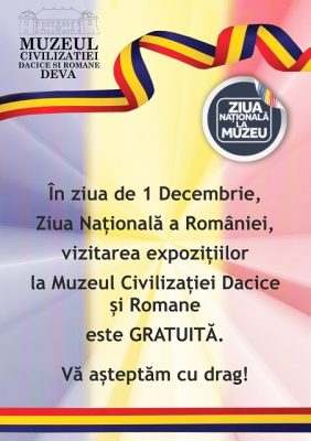 În zilele de 30 noiembrie, 1 decembrie 2023, expozițiile Muzeului Civilizației Dacice și Romane Deva sunt deschise spre vizitare, între orele: 9:00-17:00, ultima intrare ora 16.30, cu excepția celor de la Secția de Etnografie și Artă Populară din Orăștie, unde muzeul este închis.