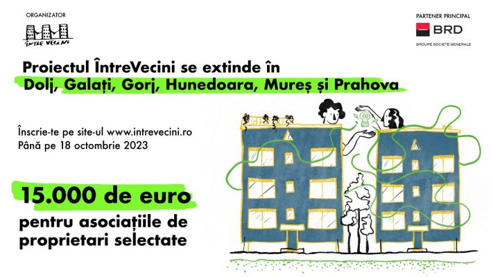 ÎntreVecini, proiectul dedicat formării de comunități reziliente, prietenoase cu mediul și bazate pe solidaritatea vecinilor, anunță extinderea programului său la nivel național. În această etapă, ÎntreVecini ajunge în șase județe din România, beneficiare ale Fondului pentru o Tanziție Justă al Uniunii Europene: Dolj, Galați, Gorj, Hunedoara, Mureș și Prahova. Cei interesați să se alăture inițiativei se pot înscrie pe platforma www.intrevecini.ro până la data de 18 octombrie 2023, completând formularul de înscriere cu mai multe detalii despre comunitatea lor și motivându-și dorința de a face parte din proiect.