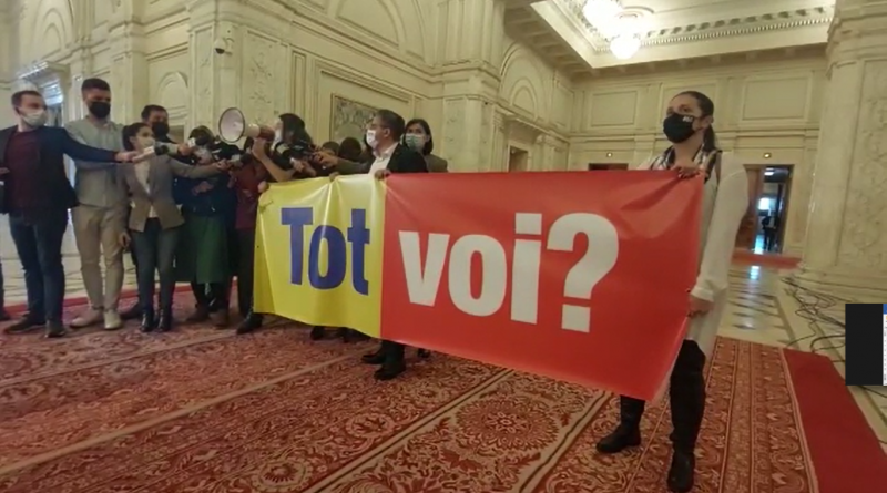 Reprezentanţii Geeks for Democracy protestează, joi, în Parlament, în timpului votului pentru învestirea Guvernului Ciucă, faţă de alianţa între PSD şi PNL. Protestatarii afişează un banner galben-roşu cu mesajul: „Tot voi?”
