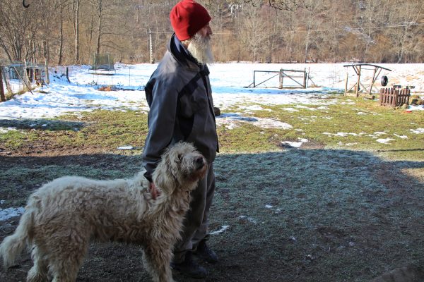 În gospodăria sa, e plin de viaţă. Ciobăneşti pletoşi păşesc alături de puiuţi cu ochi ca năstureii, căţeluşi care fugăresc pisici sau se plimbă alături de un ţanţoş cocoş alb devenit doică îngăduitoare.