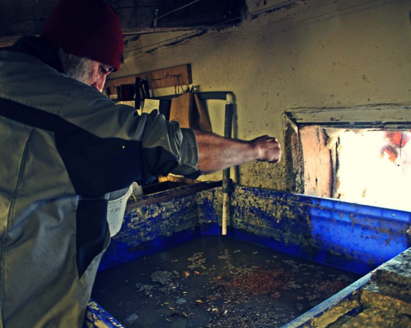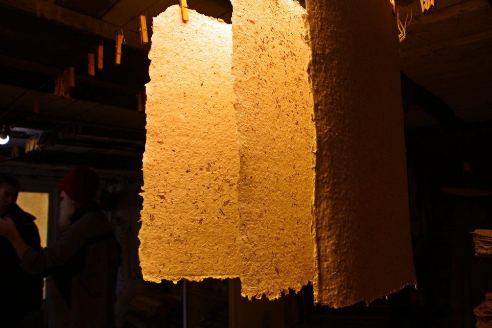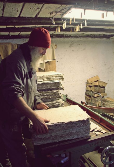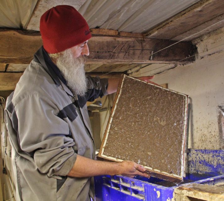 Din vană, „culege” amestecul cu o sită dreptunghiulară, sită care va da şi dimensiunile colii. Are grijă la stratul de pastă care rămâne după ce apa este în mare parte îndepărtată. Meşterul se apasă greu peste sita întoarsă peste o textilă, pentru ca materialul să se poată desprinde mai uşor de suport. Rând după rând, pastă peste textilă, totul devine un mare „tort”, care se pune în presa de stoarcere. Folile sunt scoase şi puse la uscat, după care, merg la îndreptat. Usucă colile în camere sau în pivniţa încălzită. Înşirate de-a lungul firelor, bucăţile de hârtie dau locului culoare şi aromă.