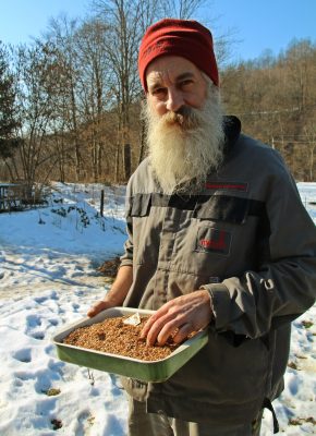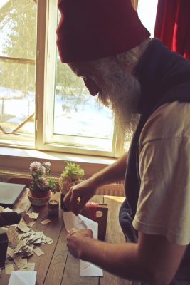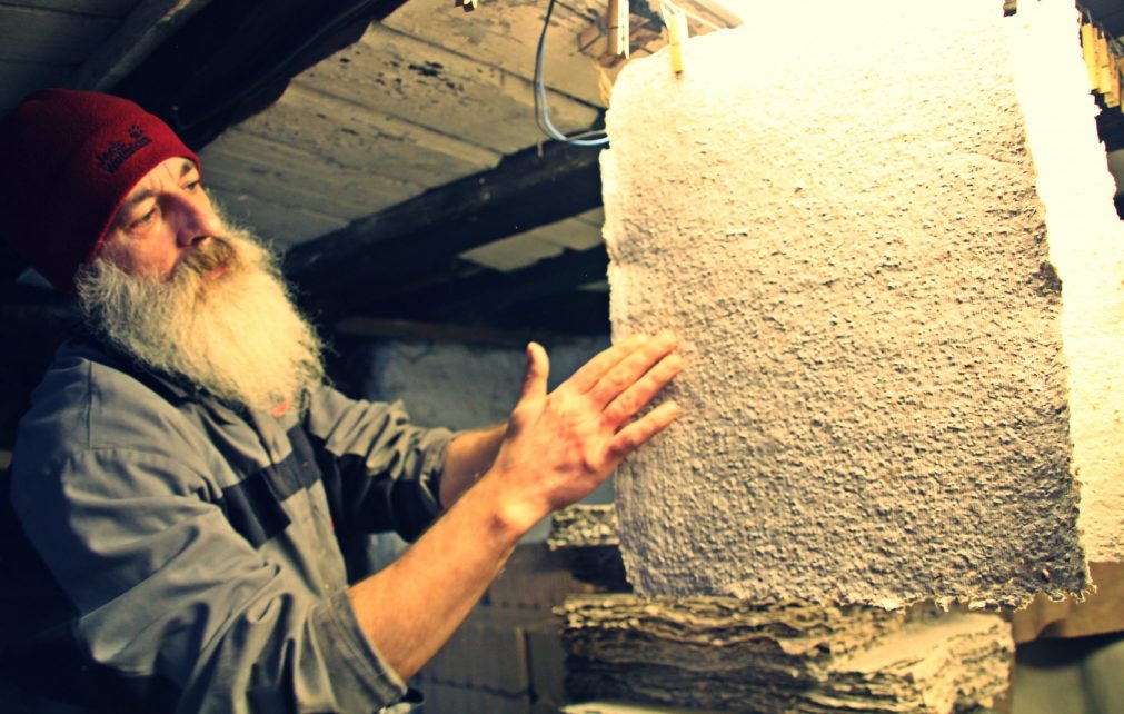 Lucrează în frig şi umezeală, printre teancuri de cartoane şi bidoane pline cu hârtie tocată. „Pasta de hârtie reciclată, ca să devină coală, trebuie pusă într-o suspensie de apă. Aici alăturăm seminţele: avem mesteceni, trifoi, lavandă şi crăiţe”, povesteşte Răzvan Supuran, în timp ce amestecă laolaltă ingredientele. Cu chipul blând şi vorba deprinsă cu cuvinte bune, cu barba albă şi gesturi largi, meşterul pare un străvechi alchimist decis să transforme banalul în minunăţie.