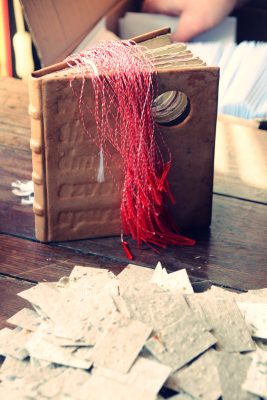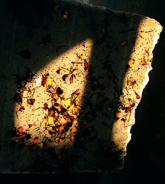 Hârtia plantabilă obţinută manual după reţeta sa este un deliciu pentru toate simţurile – textura e inedită, aroma e dată de florile de levănţică şi culoarea lor e punctată de „vitraliile” ca de miere create de petalele de flori portocalii.