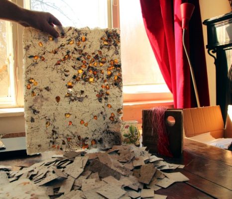 După ce amestecă bine pasta în vana mare din atelier, îşi suflecă mâinile şi trage aer adânc, să-şi facă curaj. Îi e pur şi simplu frig: „Temperatura apropiată de cea de îngheţ din atelier ne ajută să conservăm aceste seminţe. Ele, pentru a putea germina în primăvară, când temperatura pământului atinge 10 grade, trebuie să treacă prin minim două săptămâni de perioadă de îngheţ. Doar în aceste condiţii se poate face hârtie plantabilă, chiar dacă fizic este extrem de greu pentru că lucrăm cu apa la temperatură mică pentru a menţine aceste seminţe vii.”