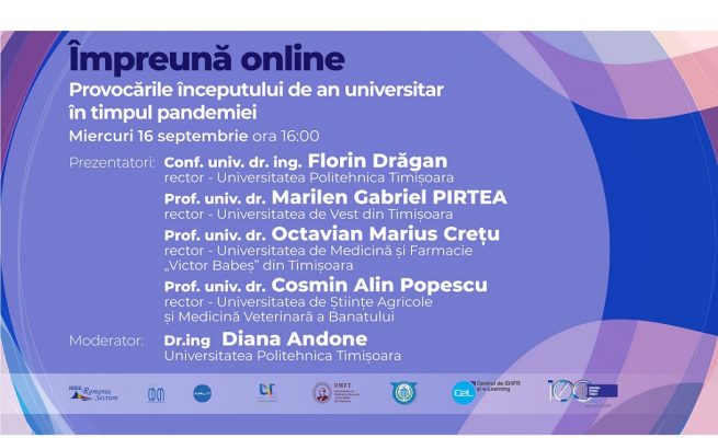 Rectorii celor patru mari universități din Timișoara vor vorbi despre provocările începutului de an universitar în timpul pandemiei și modalitățile prin care universitățile pot asigura calitatea învățământului cu ajutorul noilor tehnologii.