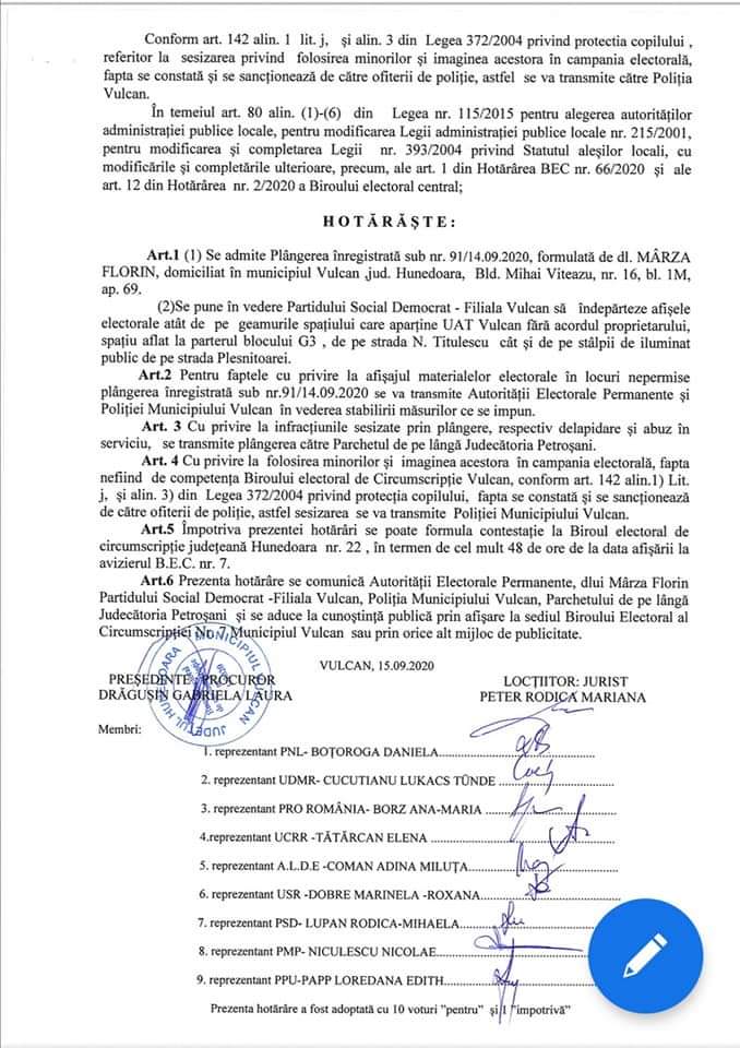 Biroul Electoral de Circumscripție Electorală nr.7 Vulcan a analizat plângerea și a constatat că ”din dovezile atașate, afișele electorale ale candidatului PSD sunt lipite atât pe geamurile spațiului care aparține UAT Vulcan fără acordul proprietarului, aflat la parterul blocului G3, de pe strada N. Titulescu cât și pe stâlpii de iluminat public de pe Strada Plesnitoarei„.