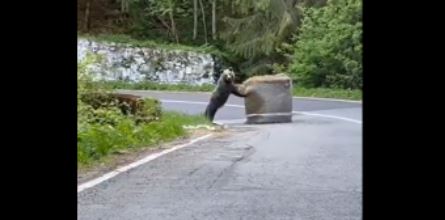 Un urs a fost filmat pe traseul Raliului Argeşului, în zona localităţii Arefu, în timp ce mută un balot de paie.