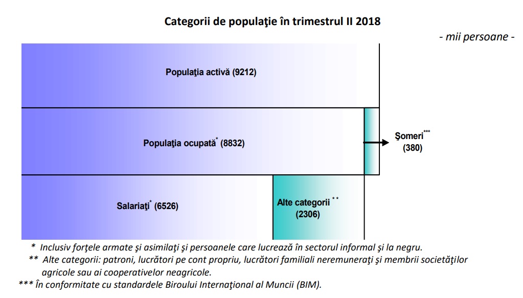 În al doilea trimestru al anului, populaţia activă a României era de 9,212 milioane persoane, din care 8,832 milioane erau ocupate şi 380.000 erau şomeri.