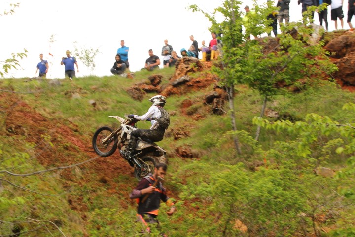 Cum era de aşteptat, după mai bine de o oră de la startul de lângă Ghelari, apar primii rideri de la clasa profi. Trec fără probleme în încurajările gălăgioase ale mulţimii şi oftatul fotografiilor care şi-ar dori ceva mai mult spectacol. Cât de curând dorinţa le este îndeplinită: nu prima, ci cea de-a doua pantă le pune probleme piloţilor din cele două clase. Motoarele împroaşcă de-a valma, pământ, bolovani şi bucăţi de iarbă ori apucă să îşi arunce oamenii din şei. Nimeni nu se dă bătut: nărăvaşele se iau de coarne, se ridică şi se repun pe traseu. Se coboară din nou pe platou şi încercarea se reia până la reuşită, când motocicliştii urcă obstacolul de piatră şi pleacă mai departe pe traseu.