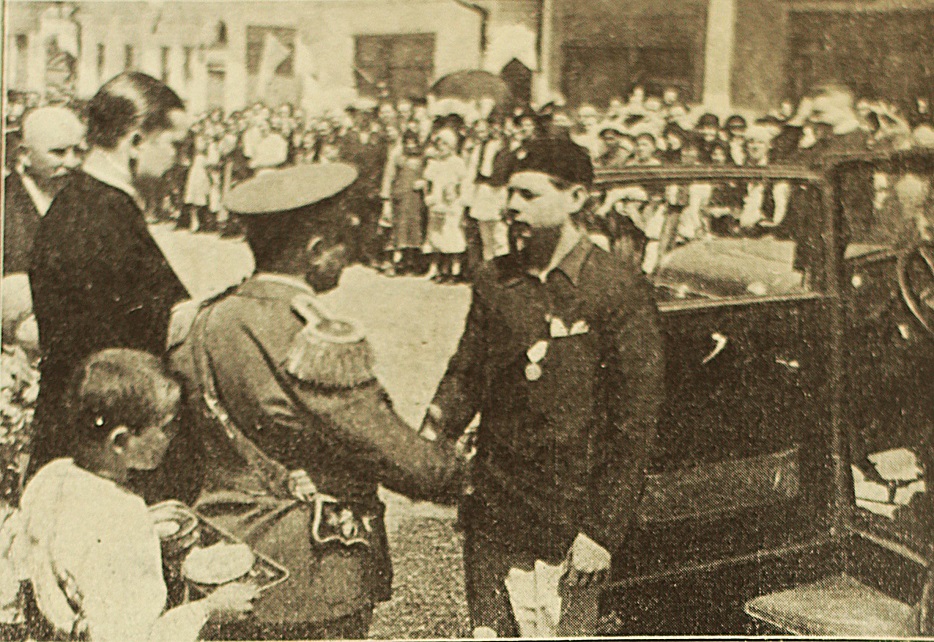 „La Pietroşani, Marele Voievod a împărţit, în ziua de 15 iunie, ajutoare şomerilor şi populaţiei locale nevoiaşe, suma de 500.000 lei. Fotografia ni-l arată cum, ajutat de colegul său Mircea Ionniţiu, Măria Sa împarte ajutoare lucrătorilor… Femei sărace, şomeri, copiii orfani sărutau plângând mâna Vlăstarului regal, din care fiecare îşi primea direct ajutorul…”.