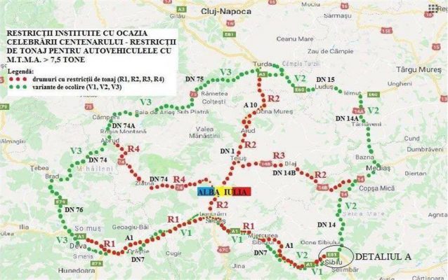 Pentru a păstra echilibrul în trafic și pentru a sprijini desfășurarea evenimentelor de amploare organizate la Alba Iulia, Compania Națională de Administrare a Infrastructurii Rutiere S.A. va institui în perioada 30.noiembrie.2018, ora 0:00, – 01.decembrie.2018, ora 24:00, restricții de tonaj pentru autovehiculele cu masa maximă autorizată mai mare de 7,5 tone pe mai multe sectoare de drumuri naționale și autostrăzi.