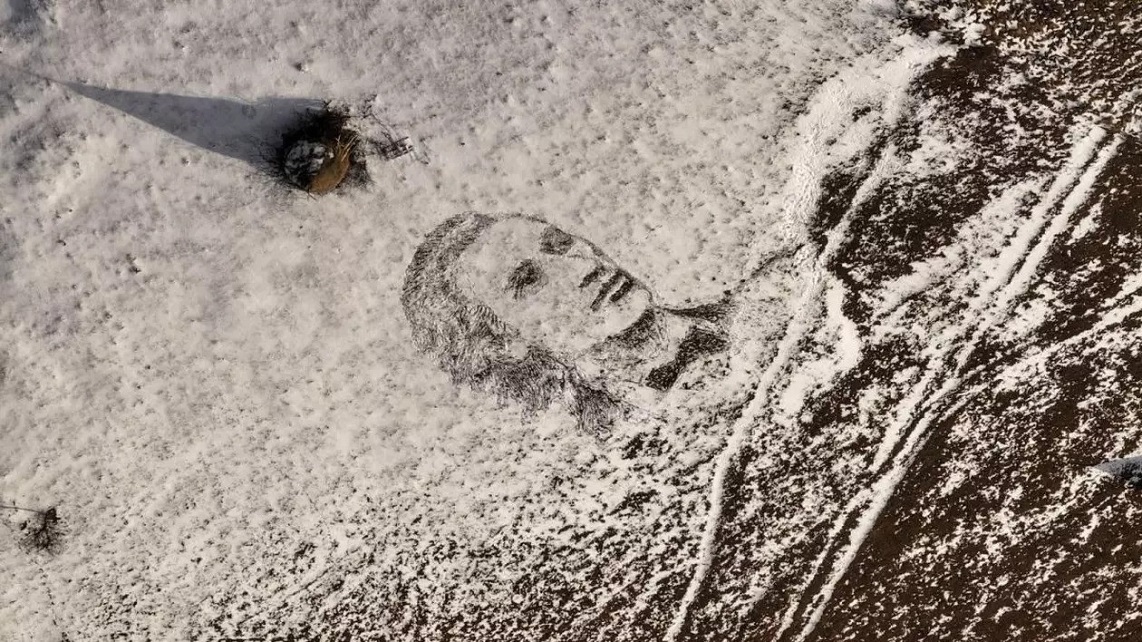 Artistul Paul Șerban din Valea Jiului a desenat cu piciorul prin zăpadă chipul lui Mihai Eminescu. Pentru această lucrare, care a fost finalizată miercuri, 15 ianuarie, când s-au împlinit 175 de ani de la nașterea poetului național, a muncit trei zile.
