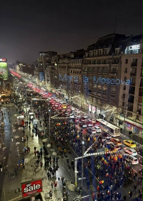 Contra manifestație pro-europeană cu laser. Un bărbat care a venit pe o motocicletă a proiectat pe fațada uneia dintre clădirile din Piața Universității mesajul „Marș la Moscova”, joi seară, în timpul manifestației extremiștilor AUR împotriva „legii Vexler”. După ce bărbatul a proiectat mesajul câțiva dintre protestatari l-au huiduit și au vrut să vină către el, dar au fost împiedicați de jandarmi. Un altul care era lângă el a încercat să îi ia proiectorul laser din mână. Cel care a afișat mesajul este Adrian Băzăvan, activist civic. Potrivit profilului din social media, a lucrat în Guvern şi la Comisia Europeană.