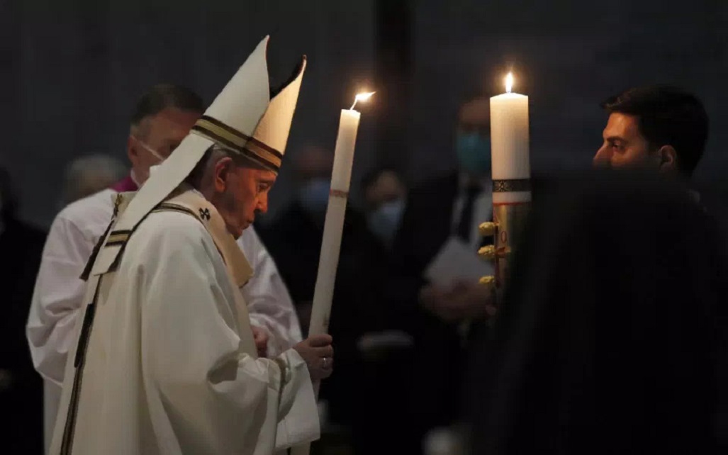 Papa Francisc sărbătorește Vigilia de Paște într-o Bazilică Sf. Petru aproape goală, în timp ce restricțiile pandemiei coronavirusului rămân în vigoare pentru al doilea an consecutiv, la Vatican.