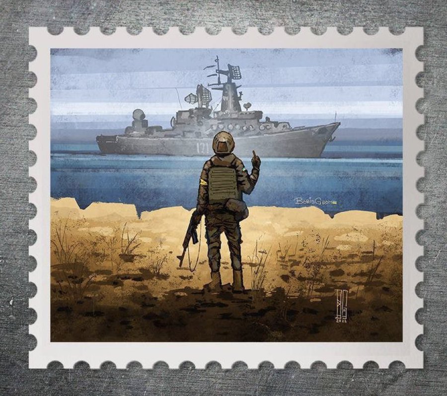 Poșta din Ucraina ar fi organizat o competiție pentru cea mai bună imagine de timbru cu tema „Navă rusească, du-te dracului”. Imaginea câștigătoare aparține artistului Boris Groh și e dedicată soldaților ucraineni de pe Insula Șerpilor care au refuzat să se predea unei nave rusești.