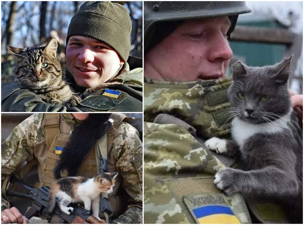 Pisicile rămase fără stăpâni în urma bombardamentelor rusești însoțesc soldații ucraineni pe front.