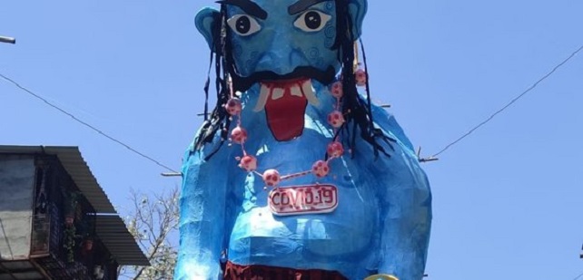 Indienii au incendiat Coronasurul. O păpușă uriașă reprezentând virusul COVID-19 a fost arsă de participanții la o sărbătoare publică în Mumbai, India. Tradițional festivitatea din Mumbai incinerează efigia unui demon. Coronavirusul este un demon albastru care are coarne și dinți amenințători. Localnicii l-au denumit Coronasur.
