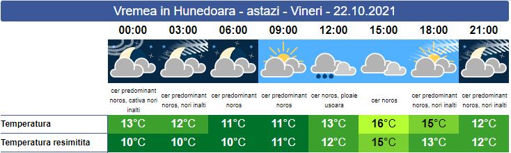Vineri, cerul va fi mai mult noros. Soarele răsare la ora 07:52. În această noapte temperaturile vor fi pozitive și mult mai ridicate față de ieri noapte. Pe tot parcursul zilei vremea va fi închisă și vor fi zone unde vor cădea precipitații sub formă de ploaie, iar la munte acestea vor avea caracter mixt. Vântul va sufla slab spre moderat. Soarele va apune la ora 18:33. Temperaturile se vor încadra între 11 și 16 grade.