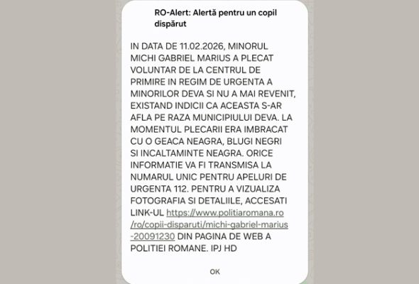Un mesaj RO-Alert a fost transmis pentru găsirea unui minor dispărut din municipiul Deva.