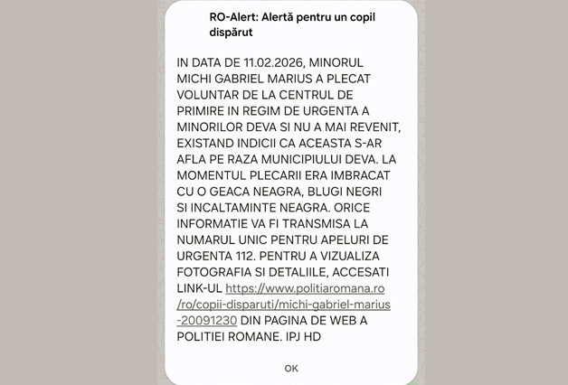 Potrivit informațiilor comunicate de autorități, în data de 11 februarie 2026, minorul Michi Gabriel Marius a plecat voluntar din Centrul de Primire în Regim de Urgență a Minorilor Deva și nu a mai revenit.