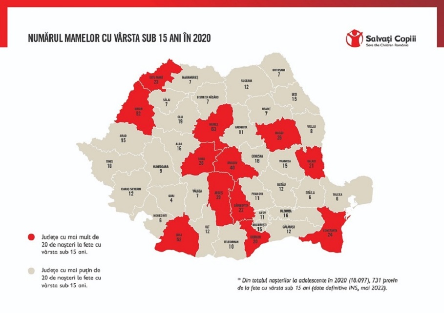 „Cu toate că România a dat sub 5% din numărul total de naşteri din Uniunea Europeană în 2020, 44,44% dintre fetele care au născut înainte de a împlini 15 ani sunt din România, care ocupă, astfel, primul loc în Uniunea Europeană la acest capitol, potrivit datelor definitive Eurostat. În cifre absolute, dintre cele 1.645 de fete cu vârsta între 10 şi 15 ani, devenite mame în 2020 în statele membre, 731 sunt românce. În total, aproape 30% din mamele minore (sub 18 ani) din UE provin din ţara noastră (8.276 din 29.505, la nivelul întregii Uniuni Europene)”, se arată într-un comunicat dat publicităţii lui de organizaţia Salvaţi Copiii.