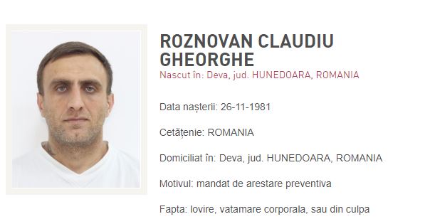 Poliţiştii continuă activităţile specifice în scopul punerii în aplicare a mandatului de arestare preventivă emis în lipsă, bărbatul fiind pus în urmărire naţională. (https://www.politiaromana.ro/ro/persoane-urmarite/roznovan-claudiu-gheorghe).