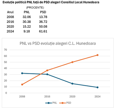 Evident, nu se aștepta nimeni ca Bobouțanu să fie bătut în alegeri de cineva, în situația politică hunedoreană a momentului, dar de la asta, până la scorul umilitor de 6,53% obținut de Lucian Gherman (PNL), e cale lungă. Iar PNL în Municipiul Hunedoara a ajuns să mai fie votat de doar 1919 hunedoreni (nici aceștia nu l-au votat toți pe propriul candidat, Gherman, care a luat doar 1372 de voturi!), mai puțini decât cei care au votat AUR, 2262.