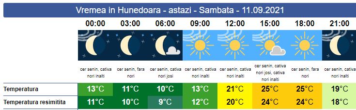 Sâmbătă, cerul va fi mai mult senin. Soarele răsare la ora 06:59. Vremea va fi plăcută cu temperaturi în creștere, iar vântul va sufla slab. La primele ore ale dimineții, în zonele joase se instalează ceața. Soarele va apune la ora 19:50. Valorile termice se vor situa între 10 și 13 grade, iar maximele vor urca în jurul valorii de 25 de grade.