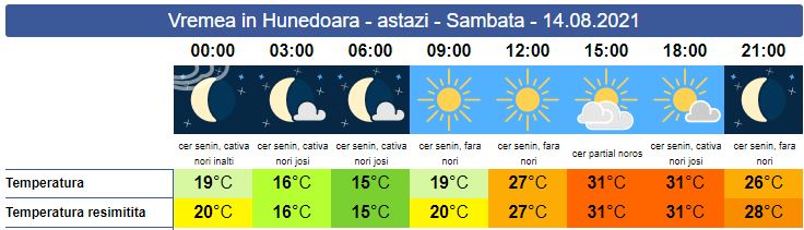 Sâmbătă, ne așteaptă o nouă zi caniculară. Soarele va răsări la ora 06:25. Cerul va fi mai mult senin. În a doua parte a zilei, cerul va deveni parțial noros, iar la munte posibil să cadă ploi de scurtă durată. Indicele de temperatură-umezeală va atinge și chiar depăși cele 80 de unități. Vântul va adia slab spre moderat. Cerul va apune la ora 20:41.Temperaturile minime se vor situa între 15 și 19 grade, iar cele maxime în jurul valorii de 31 de grade.